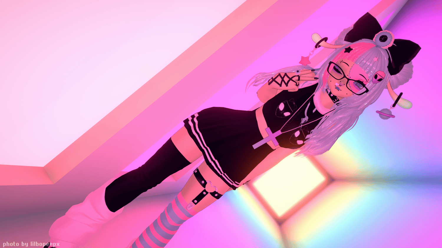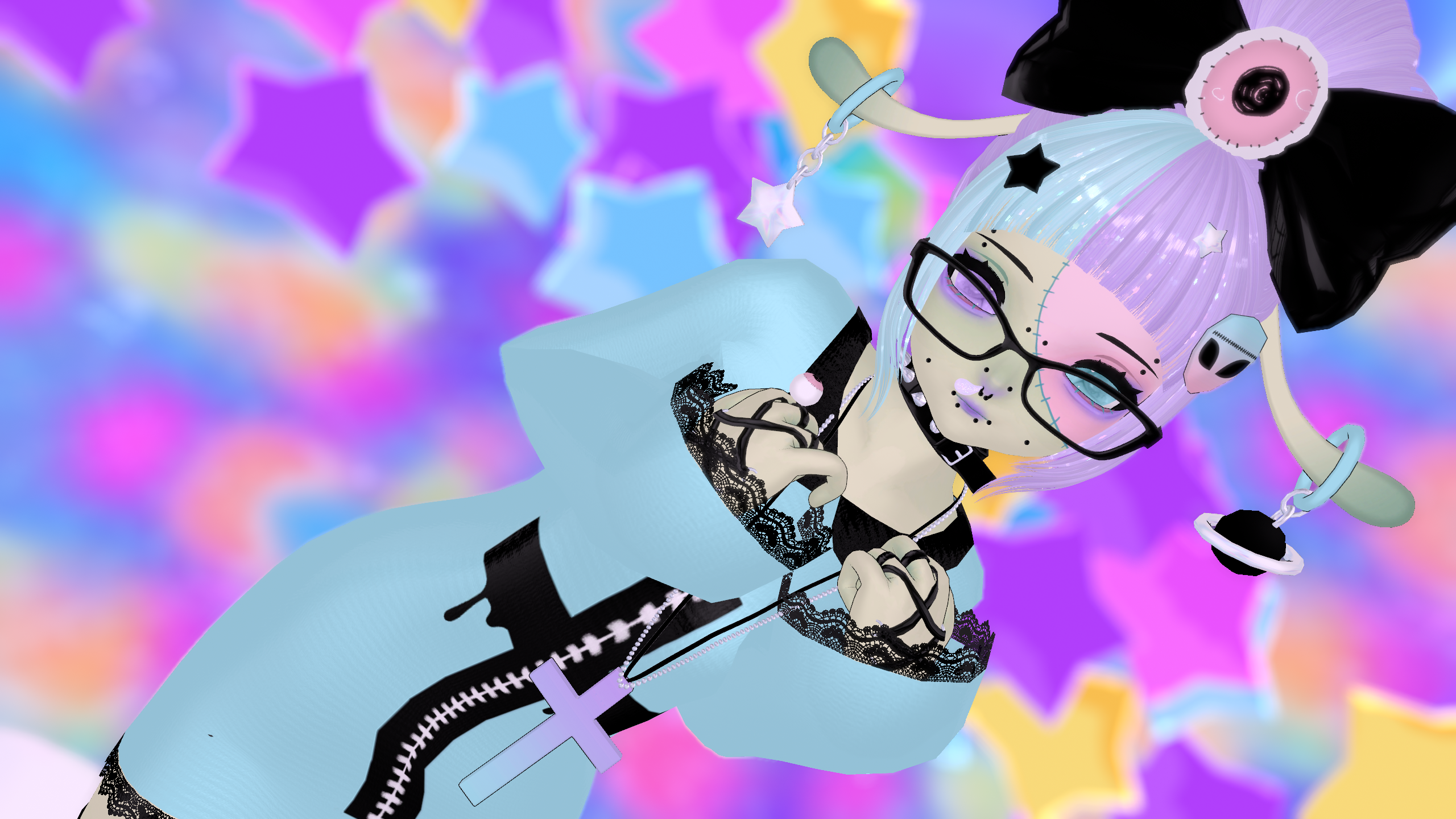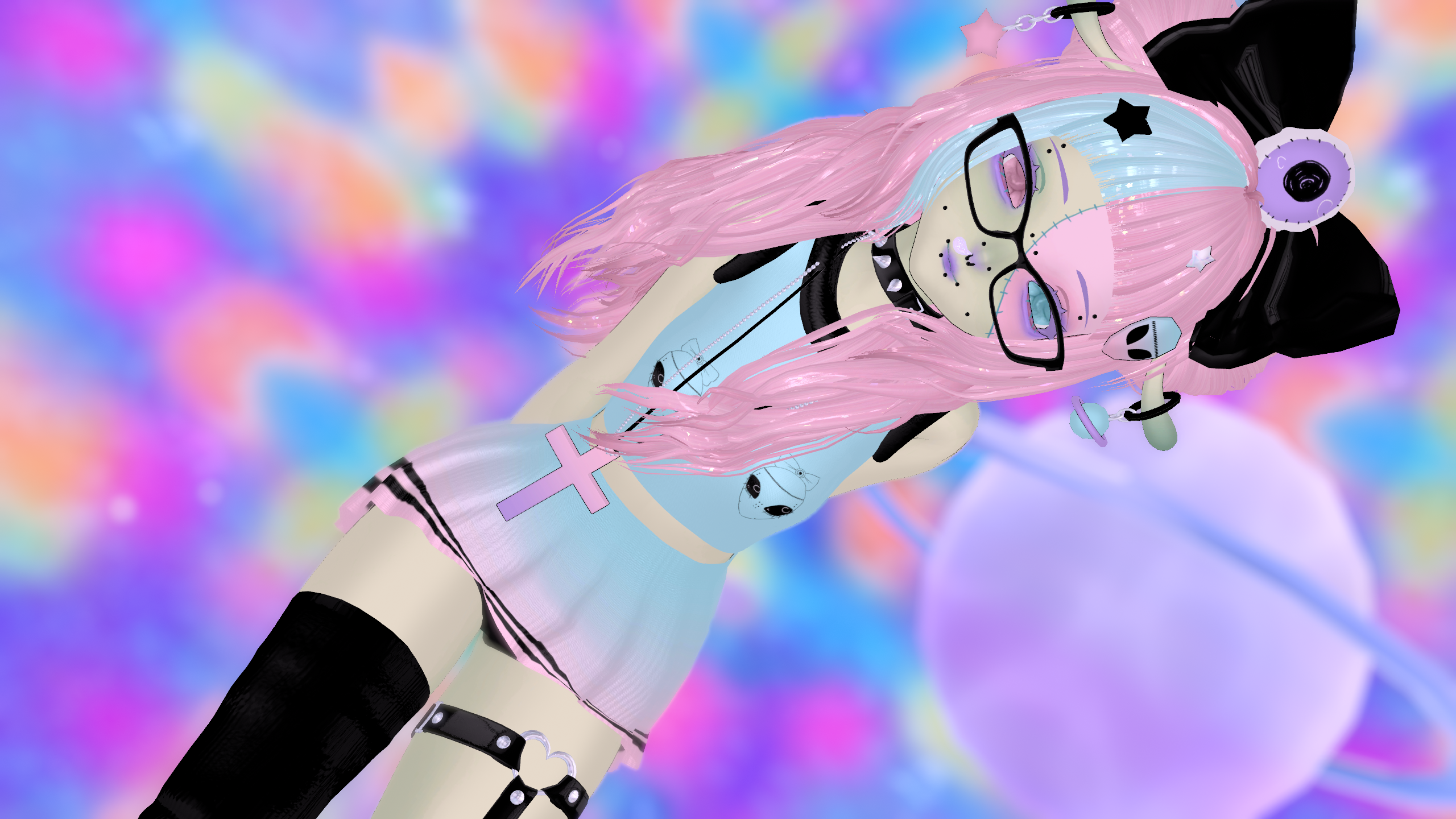 head by sivka (heavy edit by me) | dark eye texture by ezra.mp3 | pastel eye texture by gorekittwn | body by nikkiepng | hair bangs by Tink3D | hair long by TuesdayRain | hair buns by Saikura | hair bow by Zioketski | hand lace by kokori | socks by teacakezz | collar by Ritual#6666 | glasses by Dalla1re | cross necklace by sinicat3 | laced shorts by Saikura | platform shoes by Saikura | garter by apyr | heart hand gesture by .yuena. | dress, tshirt, crop top, skirt, safety shorts, eyeball accessories, antennas, and hair clips made by me.